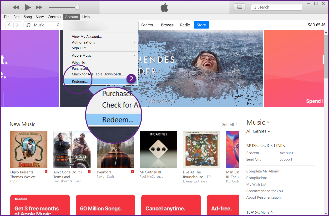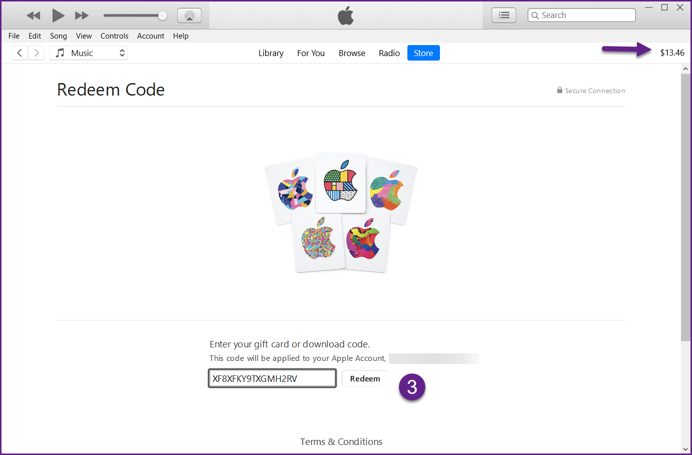 الخطوة رقم 1: نفس الخطوات تقريبا على Windows. افتح iTunes وانتقل إلى الحساب – > استرداد. بعد تسجيل الدخول إلى حسابك، اتبع التعليمات التي تظهر على الشاشة لإدخال رمز بطاقة الهدايا.